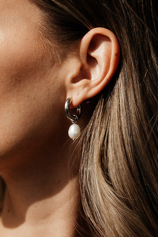 Phoebe - Silver Pearl Hoop Huggie Earrings