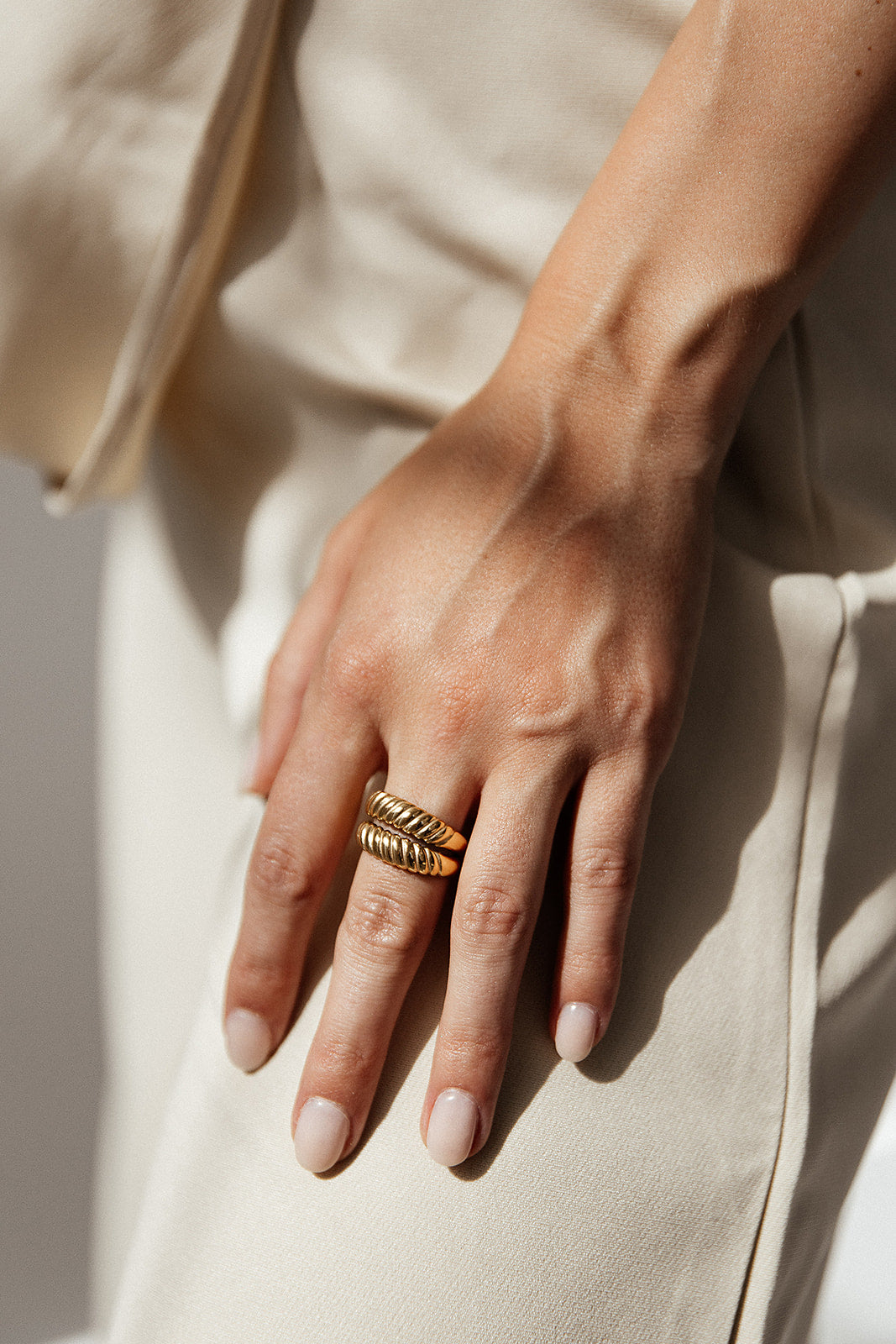 This beautiful double-layered statement ring, Daphne, is perfect for any special occasion. Expertly crafted with quality materials, it is designed to be water and tarnish resistant so you can wear it with confidence. Show off your unique style with this gorgeous croissant ring.