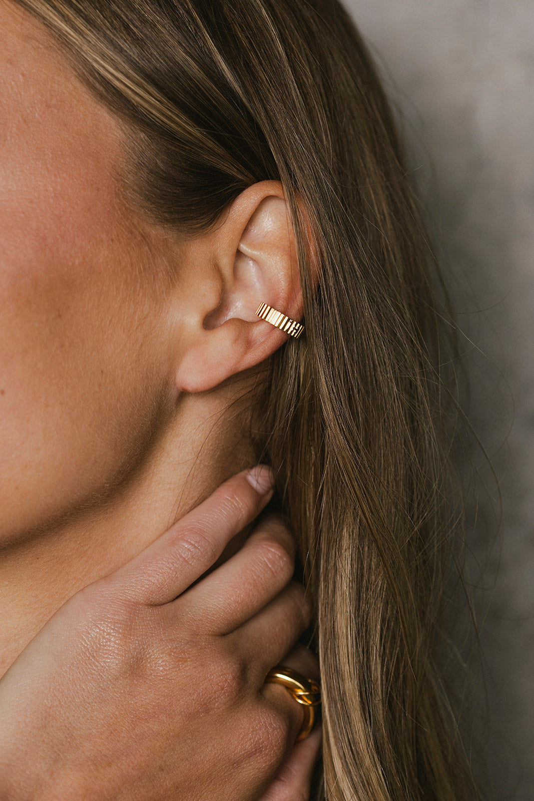 Introducing Élodie's Gold Adjustable Ribbed Ear Cuff - the perfect addition to your ear stack. Made with waterproof and tarnish-resistant materials, it offers both style and durability. With its adjustable design, it promises a perfect fit every time.