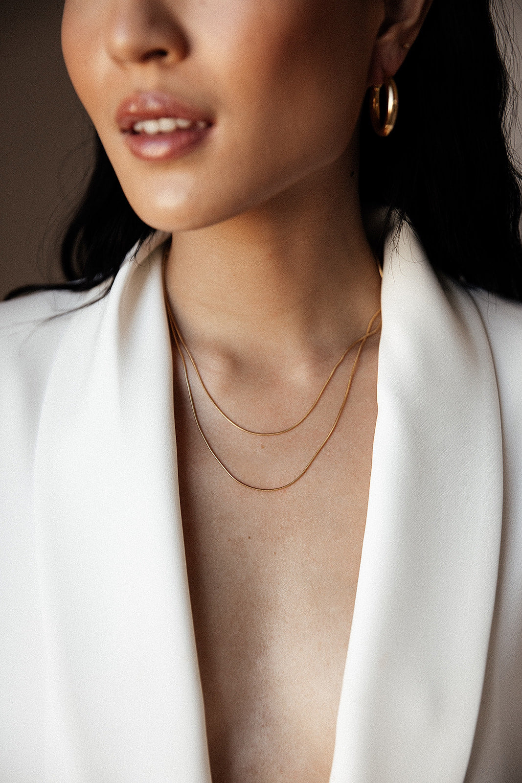 This Lana Necklace is the perfect blend of style and practicality. Made from a thin snake chain, this necklace is strong, lightweight, and water and tarnish resistant, so you can trust in its endurance. Ideal for everyday wear, this basic layering necklace is a simple and stylish addition to any outfit.