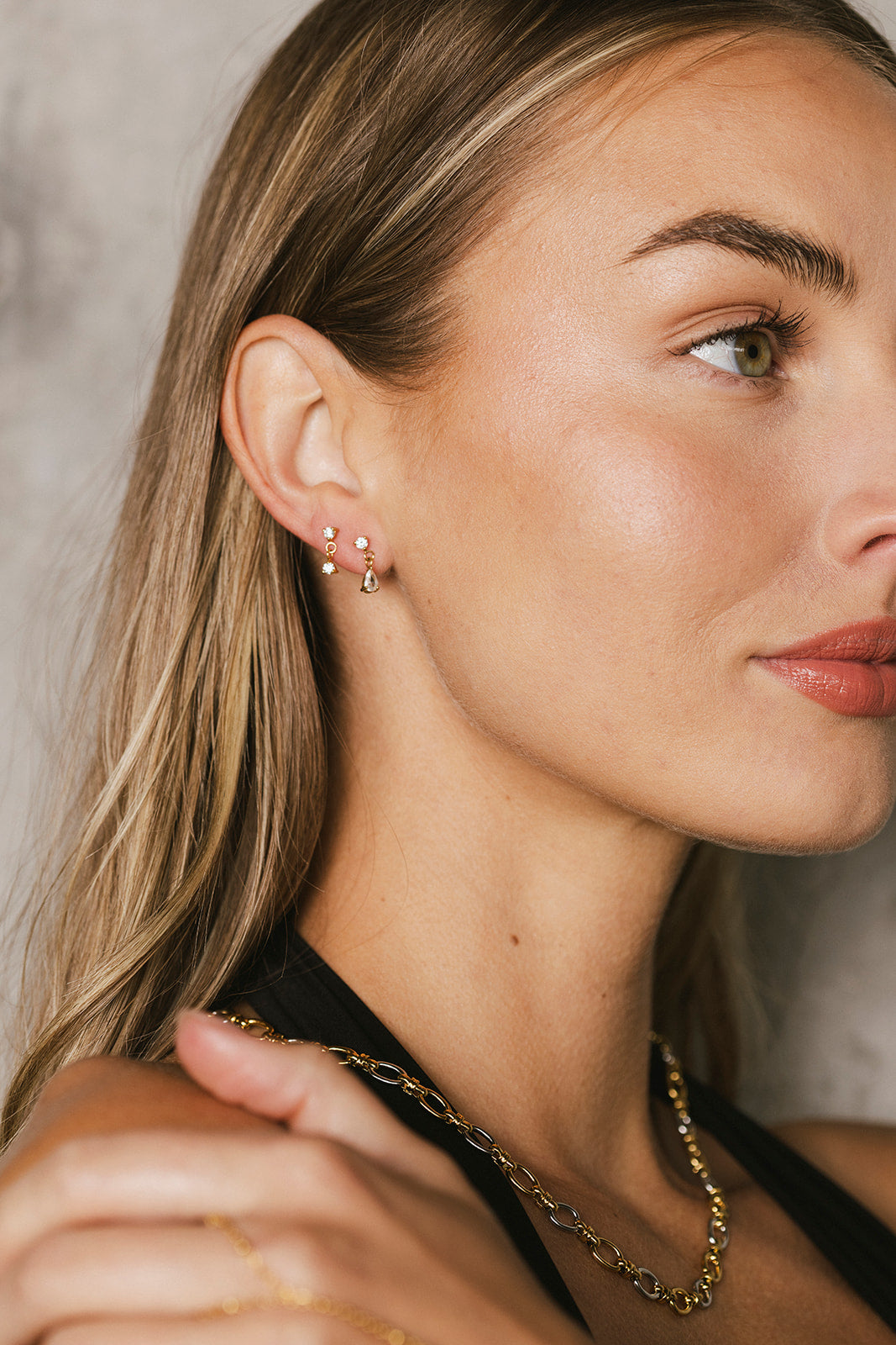 Upgrade your everyday look with Rémi's Gold Double Diamond Drop Pear Stud Earrings. Chic and affordable, these long-lasting earrings add a touch of elegance to any outfit.