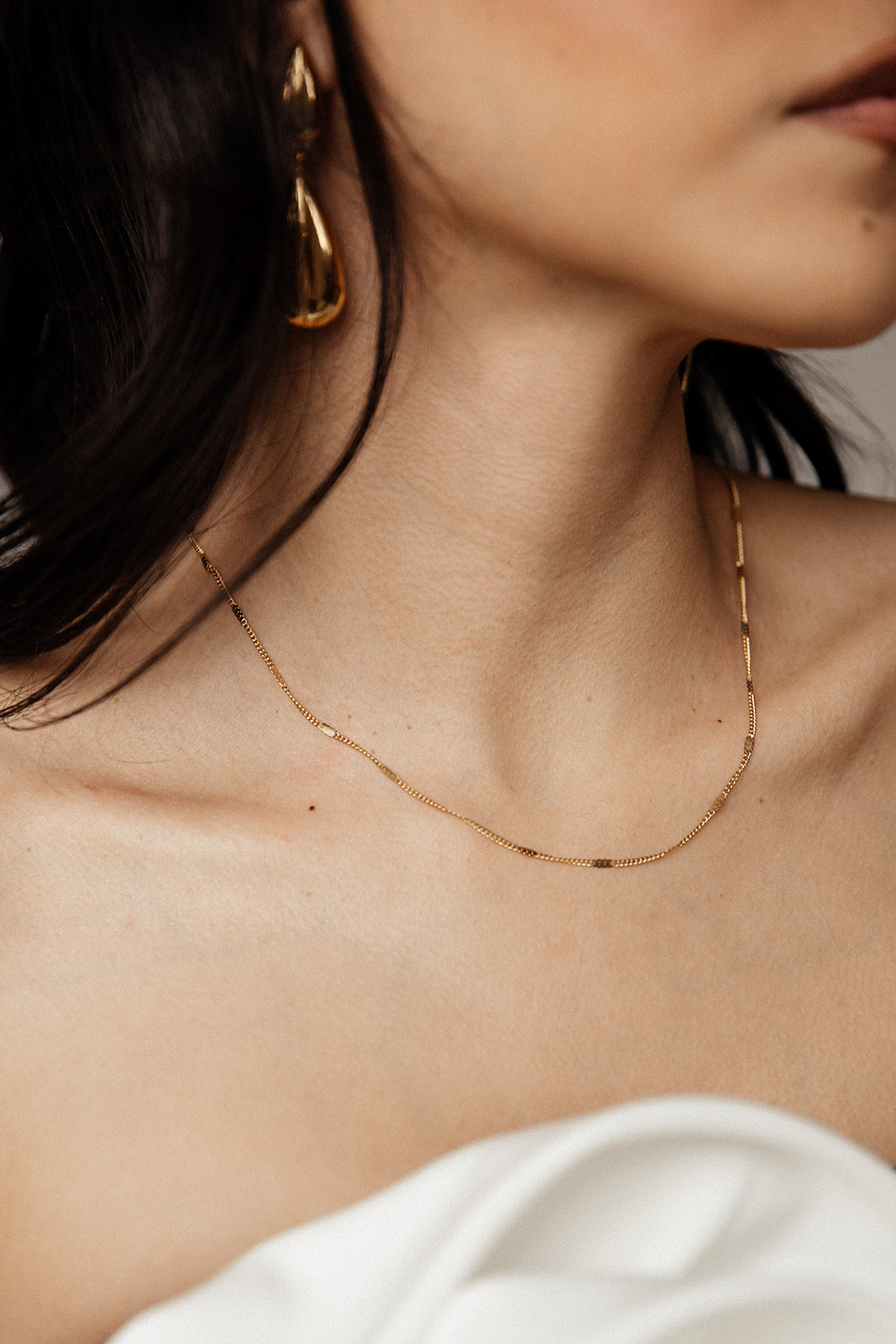 Upgrade your jewelry collection with the elegant Sophia - Gold Shimmer Chain Necklace. This beautiful accessory adds a touch of sparkle to any outfit, making it perfect for daily wear. Layer it for a chic and versatile look. Made with a gold shimmer chain, it's the ideal accessory for those who love subtle yet glamorous details.